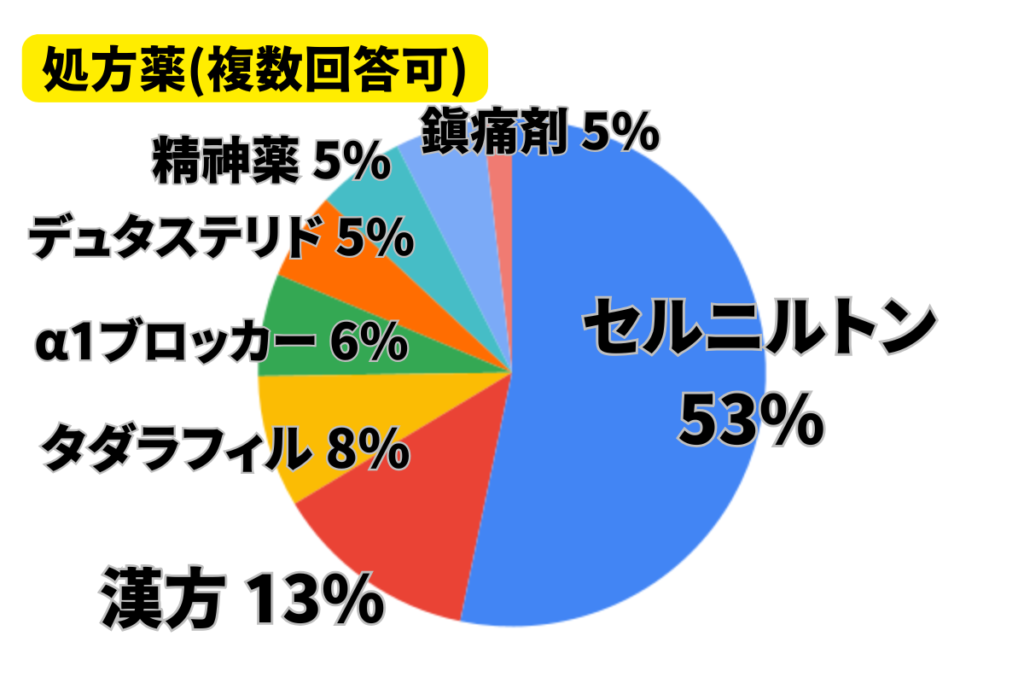 病院では主に「セルニルトン」「α1ブロッカー」「デュタステリド」「タダラフィル」や、漢方薬を処方されるのがほとんどです。