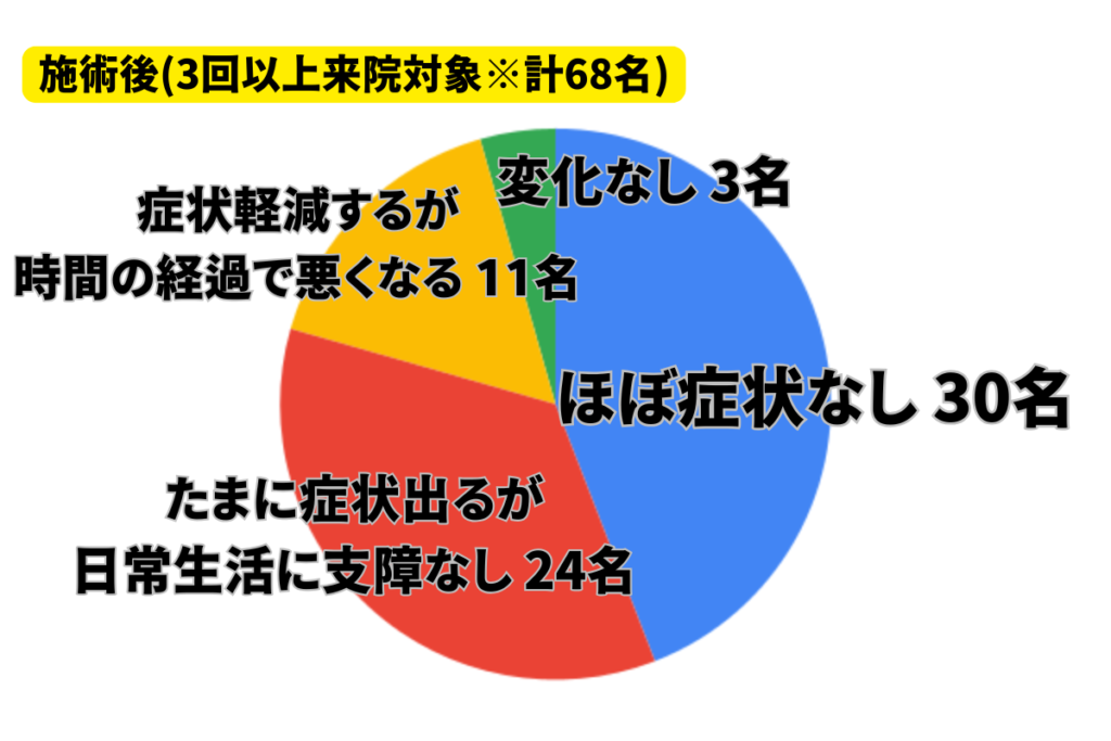 上のグラフの通り、施術後の結果としてほぼ症状なしが30名の「44.1%」、たまに症状出るが支障なしの24名を合わせると「約80%」となっております。