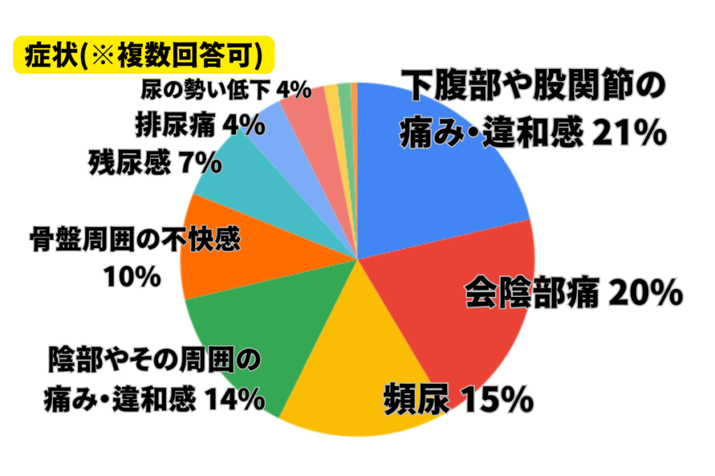 特に多いのは会陰部・鼠径部・肛門周囲に出現します。その他では下腹部・陰茎・睾丸・尿道・大腿部にも症状が出る方が多いです。一か所だけでなく、複数にわたり出現する方が大多数です。それに加えて頻尿などの排尿障害も出現する方もいます。